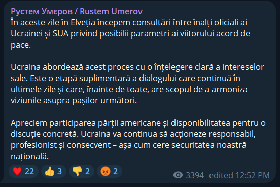 „În zilele următoare în Elveția, începem consultări între oficiali de rang înalt ai Ucrainei și Statelor Unite privind parametrii posibili ai unui viitor acord de pace”, a scris Rustem Umerov, secretar al Consiliului de Securitate al Ucrainei și membru al echipei de negociere, pe Telegram.
