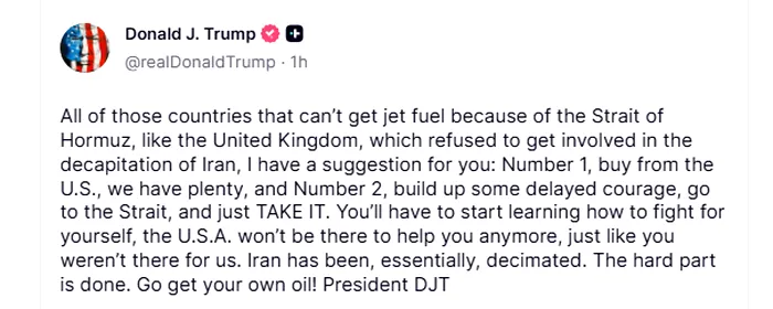 „Toate acele țări care nu pot obține combustibil pentru avioane din cauza Strâmtorii Hormuz, cum ar fi Regatul Unit, care a refuzat să se implice în decapitarea Iranului, am o sugestie pentru voi: Numărul 1, cumpărați de la SUA, avem destul, și Numărul 2, adunați-vă puțin curaj, mergeți în Strâmtoare și pur și simplu IAȚI-L. Va trebui să începeți să învățați cum să luptați pentru voi înșivă, SUA nu vor mai fi acolo să vă ajute, la fel cum voi nu ați fost acolo pentru noi. Iranul a fost, practic, decimat. Partea grea e trecută. Mergeți să vă luați propriul petrol! Președintele DJT”.