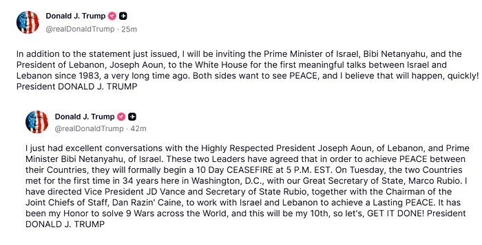 „Am avut discuții excelente cu președintele mult respectat Joseph Aoun al Libanului și cu premierul Israelului, Bibi Netanyahu. Cei doi lideri au convenit să ajungă la pace între cele două țări printr-un armistițiu de 10 zile. Marți, cele două țări se vor întâlni pentru prima dată în 34 de ani la Washington DC, cu secretarul nostru măreț, Marco Rubio. (…). A fost o onoare să încetez 9 războaie din lume, iar ăsta va fi al zecelea război încheiat de mine”.