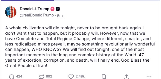 „La noapte, o întreagă civilizație va muri, fără să mai poată fi readusă niciodată la viață. Nu voiam să se întâmple, dar se va întâmpla probabil. Totuși, acum că am finalizat schimbarea regimului în totalitate, unde mințile mai diferite, mai inteligente, mai puțin radicalizate vor reuși, poate ceva revoluționar se va întâmpla, CINE ȘTIE? Vom afla diseară, una dintre cele mai importante momente din istoria complexă și lungă a umanității. 47 de ani de corupție, extorcare și moarte, se vor încheia în sfârșit. Dumnezeu să binecuvânteze mărețul popor al Iranului!”