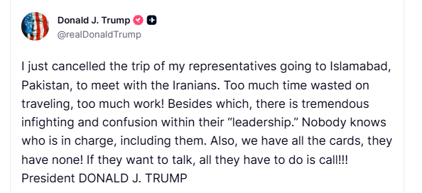 „Tocmai am anulat călătoria reprezentanților mei care mergeau la Islamabad, Pakistan, pentru a se întâlni cu iranienii. Prea mult timp pierdut cu călătoriile, prea multă muncă! Pe lângă acestea, există lupte interne și confuzie imense în cadrul „conducerii” lor. Nimeni nu știe cine este la conducere, inclusiv ei. În plus, noi avem toate cărțile, ei nu au nicio! Dacă vor să vorbească, tot ce trebuie să facă este să sune!!!”, a scris Trump pe Truth Social.