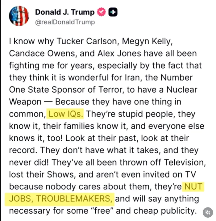 Într-o altă postare anterioară de pe Truth Social,  Trump a spus că are la cunoștință că toți cei patru jurnaliști și comentatori politici au luptat împotriva sa de mai mulți ani. Președintele i-a acuzat că „ei gândesc că este minunat ca Iran, sponsorul nr. 1 al terorismului, să aibă arma nucleară” și i-a descris ca pe niște persoane „stupide, cu IQ scăzut”.