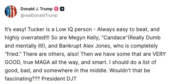 „E simplu! Tucker are un IQ scăzut – mereu ușor de învins și e extrem de supraevaluat!!! La fel sunt și Megyn Kelly, „Candace” (foarte proastă și bolnavă mintal!), și falitul Alex Jones, care e complet „prăjit”. Mai sunt și alții! Apoi avem câțiva care sunt FOARTE BUNI, adevărați MAGA până la capăt și inteligenți. Ar trebui să fac o listă cu buni, răi și undeva la mijloc. N-ar fi fascinant??? ”, a scris președintele pe Truth Social.