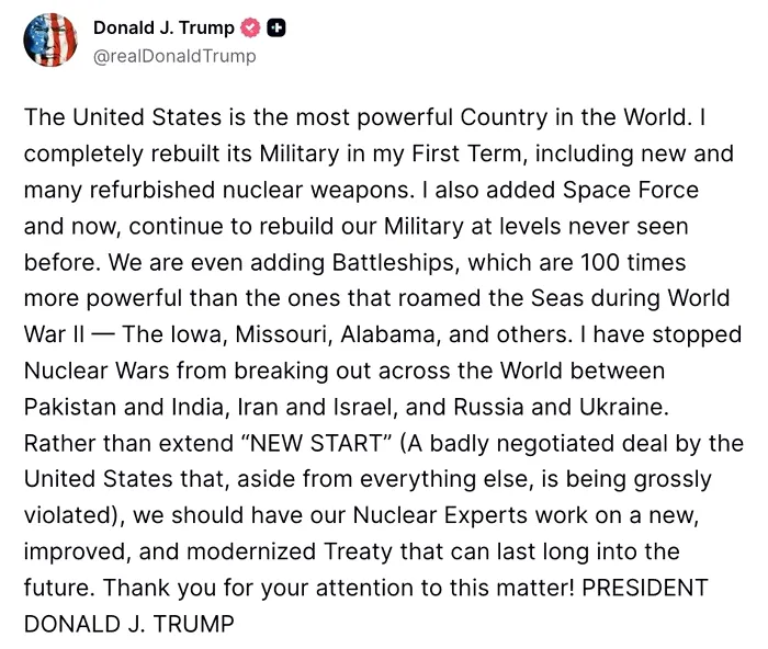 „Statele Unite sunt cea mai puternică țară din lume. Mi-am reconstruit complet armata în primul meu mandat, incluzând arme nucleare noi și numeroase arme recondiționate. Am adăugat, de asemenea, Forța Spațială și acum continuăm să ne reconstruim armata la niveluri nemaivăzute până acum. Adăugăm chiar și nave de luptă, care sunt de 100 de ori mai puternice decât cele care au cutreierat mările în timpul celui de-al Doilea Război Mondial – Iowa, Missouri, Alabama și altele. Am oprit izbucnirea războaielor nucleare în întreaga lume între Pakistan și India, Iran și Israel și Rusia și Ucraina. În loc să prelungim „NOUL START” (un acord prost negociat din start de Statele Unite care, pe lângă toate celelalte, este încălcat grav), ar trebui să-i punem pe experții noștri nucleari să lucreze la un tratat nou, îmbunătățit și modernizat, care să poată dura mult timp în viitor.”, a declarat Trump într-o postare scrisă pe Truth Social.