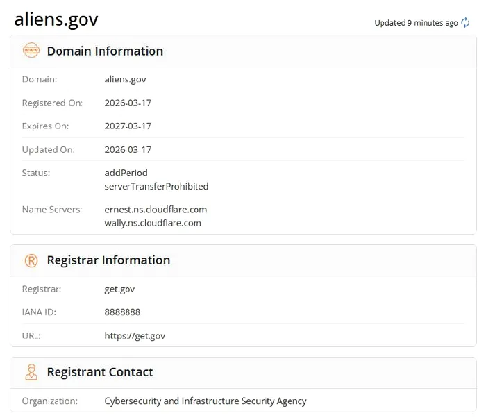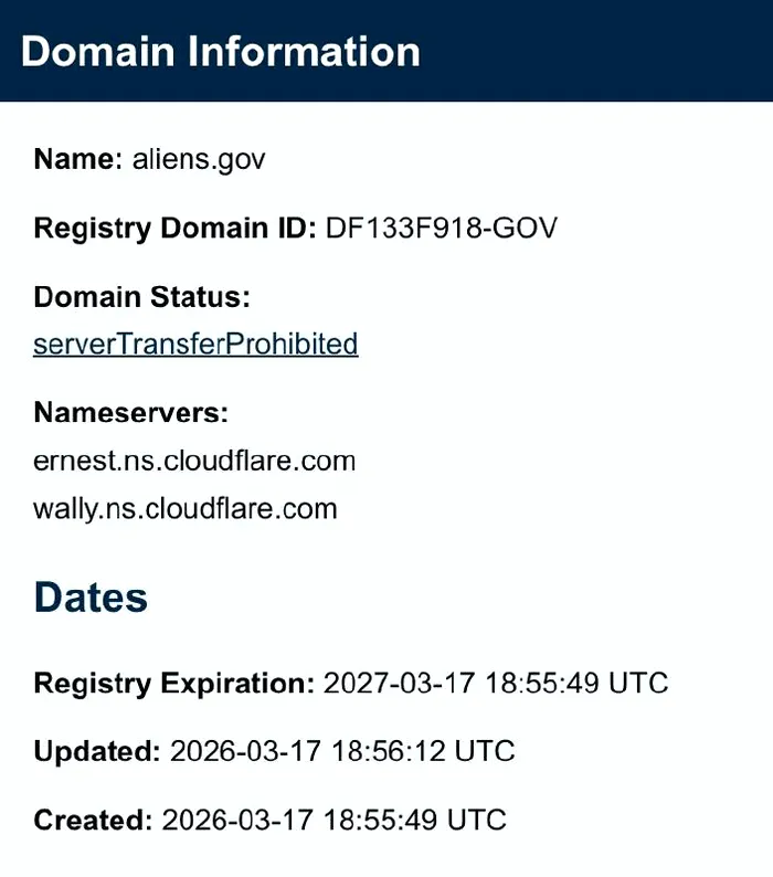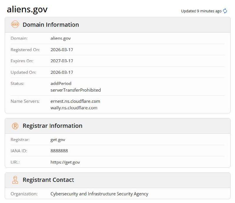 În data de 18 martie 2026, un sistem automatizat a semnalat că aliens.gov a fost adăugat în registrul oficial.gov, controlat de Agenția pentru Securitate Cibernetică și Infrastructură din SUA (CISA). Domeniul este listat ca fiind parte a Biroului Executiv al Președintelui, dar nu afișează nicio pagină activă sau scop public anunțat.