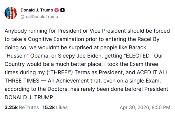 Trump consideră că numai prin examinarea cognitivă, votanții americani n-ar mai vota personalități politice ca Barack Obama sau Joe Biden, poreclit „Somnorosul”.