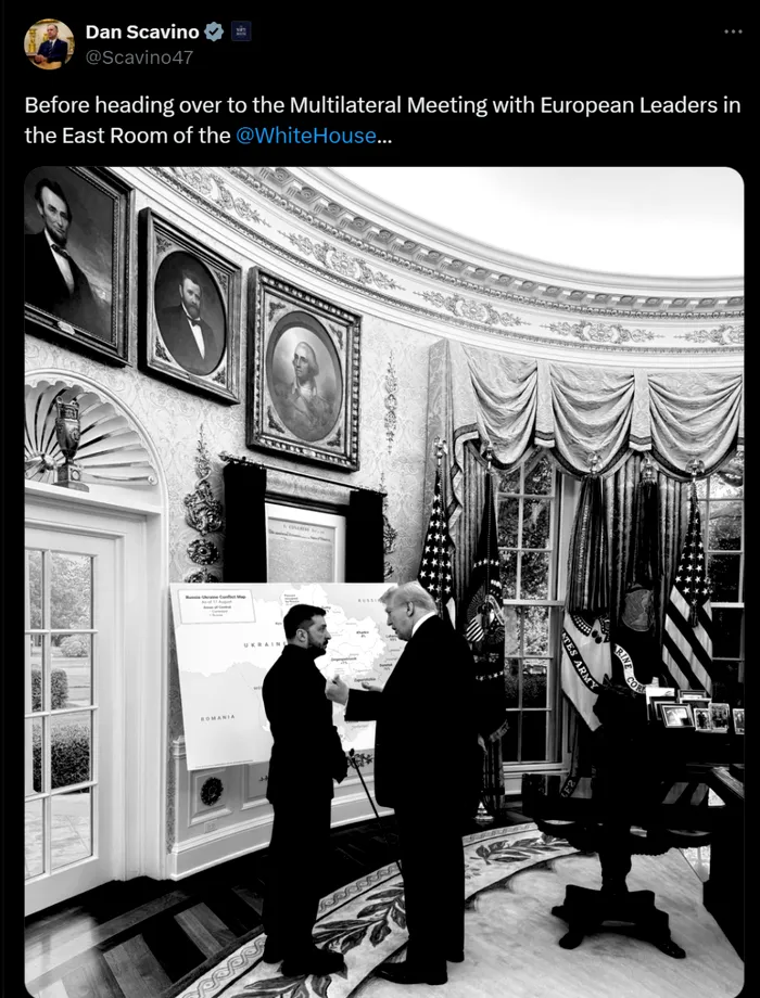 În Biroul Oval, Donald Trump și Volodimir Zelenski, însoțit de doi președinți, trei premieri europeni, precum și de șefa Comisiei Europene și de secretarul general al NATO,.