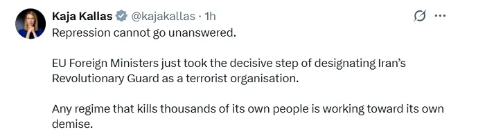 Kaja Kallas, șefa diplomației europene, a anunțat printr-o postare pe X, în urma reuniunii miniștrilor de externe ai UE de la Bruxelles, că IRGC este considerat de acum înainte organizație teroristă. Măsura a fost luată ca răspuns la reprimarea brutală a protestelor din Iran, începute la finalul anului 2025 și soldate cu mii de morți în rândul civililor.