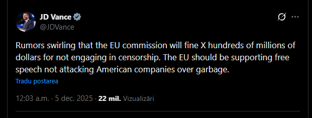 Anticipând anunțul Comisiei, vicepreședintele Statelor Unite, JD Vance, a declarat, seara trecută, că o amenda este de fapt pentru „neimplicarea în cenzură”