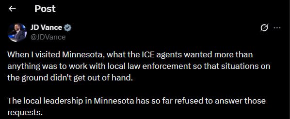 Vicepreșdintele JD Vance a declarat într-o postare pe X că vinovate pentru situația curentă sunt autoritățile locale din Minnesota:
