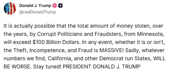 „Este posibil ca suma totală de bani furați de către politicienii corupți și frauduloși din Minnesota să depășească 100 de miliarde de dolari. În orice caz, frauda, jaful și incompetența sunt MASIVE! Trist este că cifrele pe care le-am putea găsi în California și alte state conduse de democrați ar putea fi mai îngrozitoare. Stați pe fază”, a scris președintele pe Truth Social.
