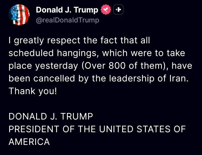 Între timp, Donald Trump a anunțat cu încântare pe Truth Social că cele 800 de execuții prin spânzurare care erau programate pentru ziua de ieri (15 ianuarie 2026) au fost anulate la comanda liderilor iranieni.