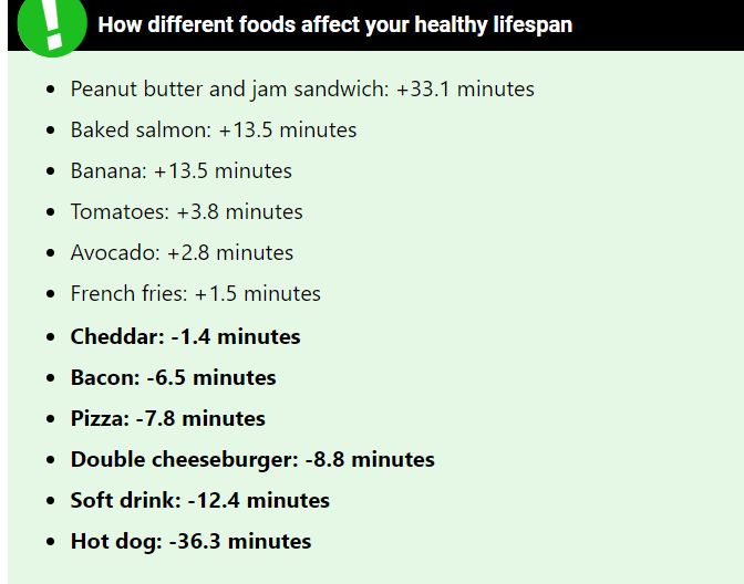 Cercetătorii au studiat 5.800 de alimente consumate în mod obișnuit, și au descoperit, de asemenea, că aripioarele de pui îți vor scădea 3,3 minute din viață, în timp ce – poate surprinzător – un sandwich cu unt de arahide și gem ar putea crește durata de viață cu peste o jumătate de oră.