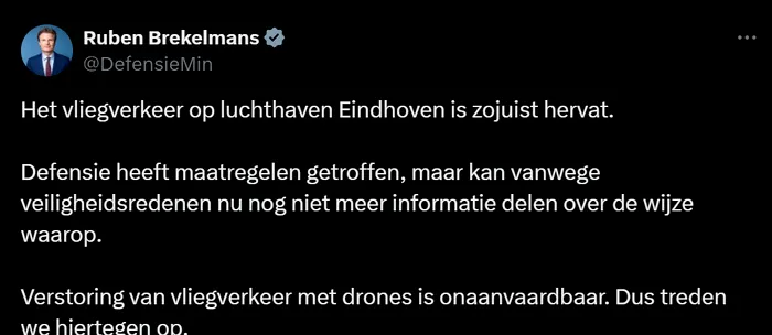 Ministrul Apărării Ruben Brekelmans spune că a luat măsuri pentru reluarea traficului, dar din motive de securitate, nu poate oferi mai multe informații despre maniera în  care a procedat pentru a îndepărta dronele, presupuse a fi operate de Federația Rusă după survolurile inexplicabile din Germania, Belgia și Danemarca.