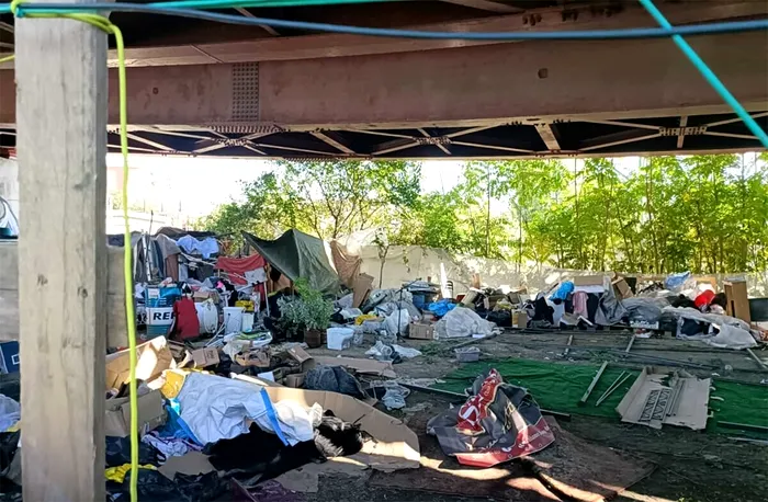 Adăpostul este mascat între cutii de carton, cărucioare de supermarket, grămezi de haine, sticle goale și o saltea veche.