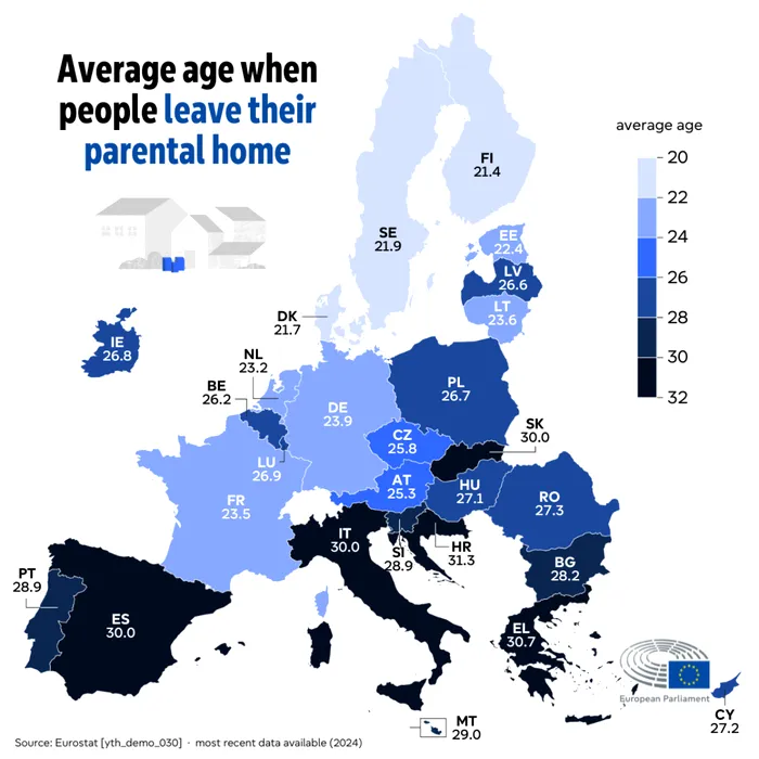 Costul locuințelor este unul din factorii pe care tinerii îl iau în considerare atunci când decid să se mute din casa familiei și să înceapă o viață pe cont propriu. Alți factori evidețiați de Eurostat sunt: situația de pe piața muncii, obiceriurile culturale și costul vieții în general. În Uniunea Europeană, vârsta medie de părăsire a casei părintești a fost de 26,2 ani în 2024. Vârsta variază, bineînțeles, în funcție de țările UE: de la o medie de 21,4 ani în Finlanda la 31,3 ani în Croația. În România, vârsta medie la care tinerii decid să se mute la casa lor este de 27,3 ani.
