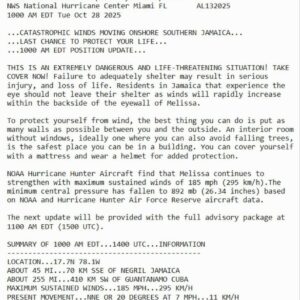 Uraganul Melissa, de categorie 5, a devenit mai puternic decât uraganul Katrina, fiind acum al cincilea cel mai intens uragan înregistrat vreodată în Atlantic. În prezent, se apropie de coastele Jamaicăi, unde autoritățile, precum și cele din Cuba, au ordonat evacuarea populației din zonele expuse.