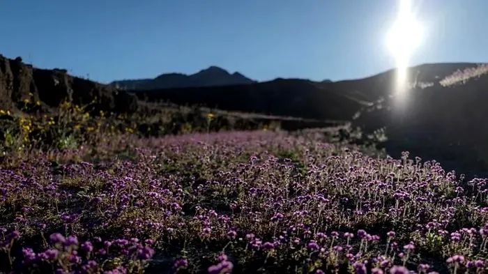 Peisajul obișnuit, dominat de nisip și stâncă, s-a transformat într-un covor de culori. Zone întinse ale deșertului sunt acum acoperite de nuanțe aurii și violete, într-un spectacol natural rar.