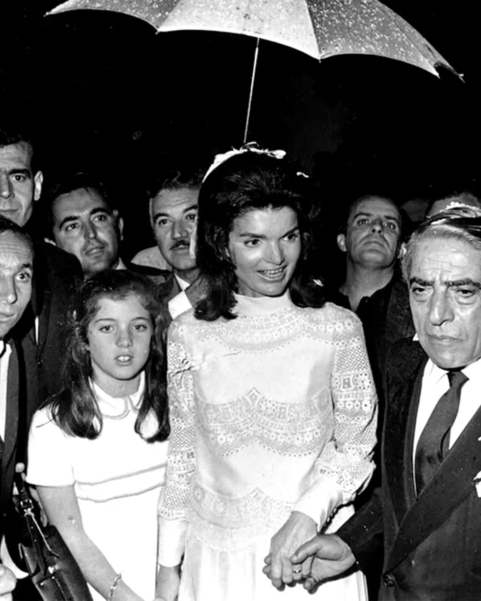 Jackie Kennedy Onassis a purtat o ținută Valentino, unul dintre designerii ei preferați la acea vreme, la a doua sa nuntă cu Aristotel Onassis.