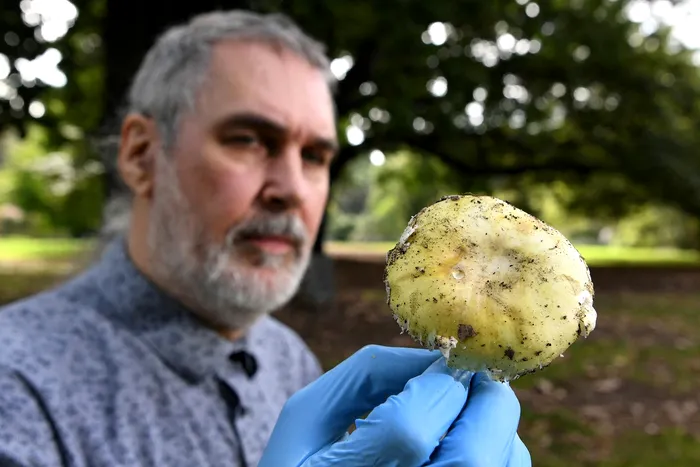 Cercetătorul științific principal (micologie) Tom May de la Grădinile Botanice Regale inspectează o ciupercă Amanita phalloides, o ciupercă extrem de toxică și responsabilă pentru 90% din decesele cauzate de otrăvirea cu ciuperci, în Melbourne, pe 31 martie 2021.