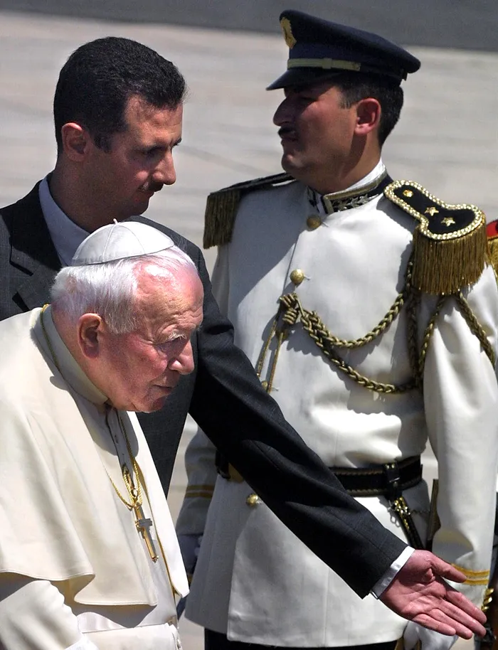 Bashar al-Assad și Papa Ioan Paul al II-lea trec în revistă garda de onoare, la sosirea Papei la Damasc de la Atena, pe 5 mai 2001. Pontiful a fost în Siria într-o vizită de patru zile ca parte a pelerinajului său pe urmele Sfântului Pavel.