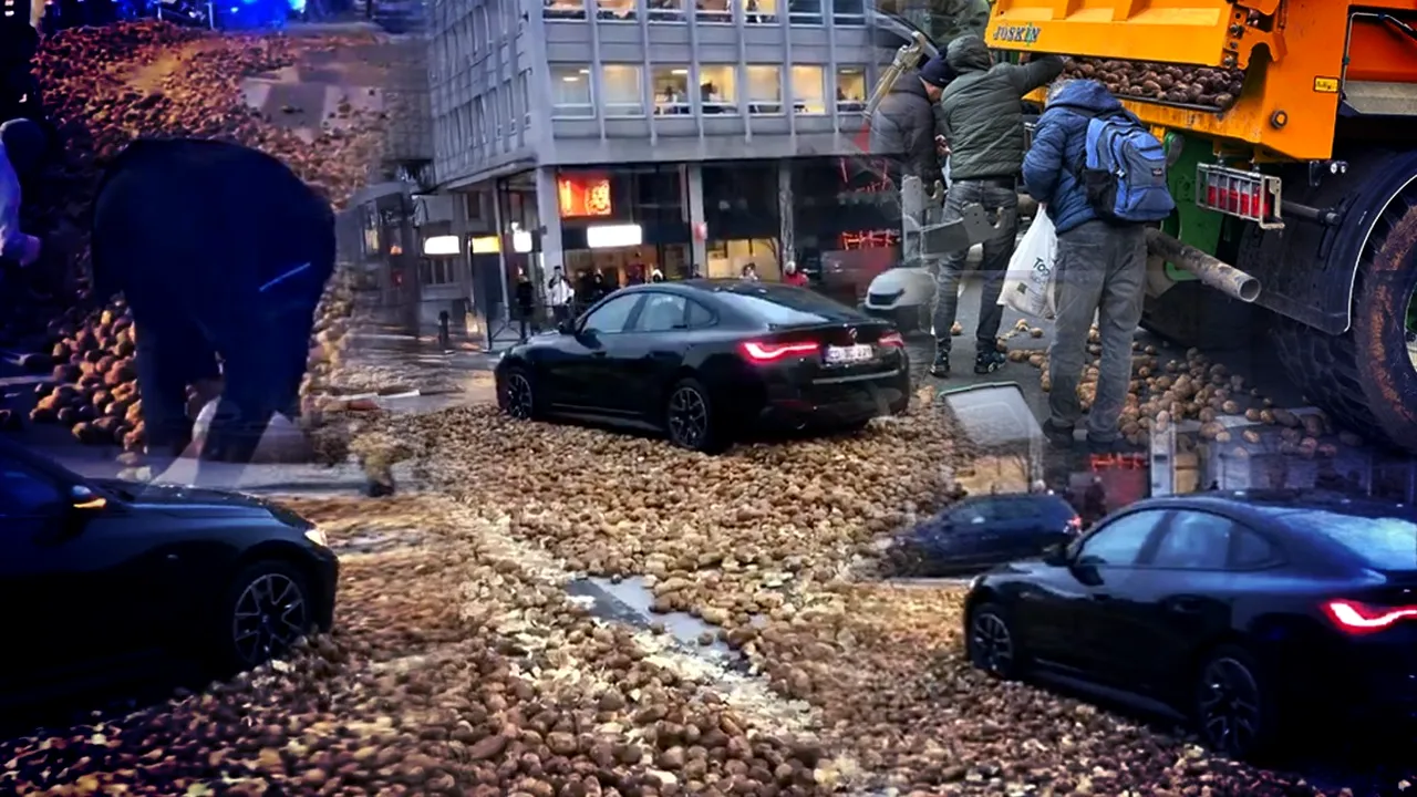 Tone de cartofi au fost aruncate pe străzile din capitala Belgiei iar un șofer, încrezător în capacitățile mașinii sale, a încercat să treacă pe o stradă acoperită în totalitate de cartofi, doar că a rămas în cele din urmă blocat. Oricât a încercat șoferul să iasă din încurcătură, tentativele au fost în zadar.