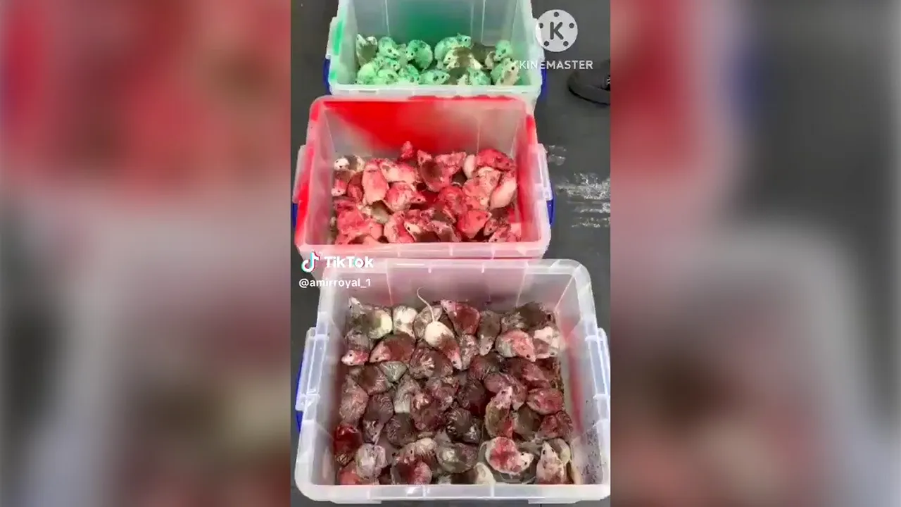Imaginile arată șoareci vii, împărțiți inițial pe culori, în cutii diferite. În imaginea următoare se vede cutia cu rozătoarele amestecate scoasă din portbagajul unei mașini cu plăcute false de înmatriculare pe care scrie „PAIISTN”.