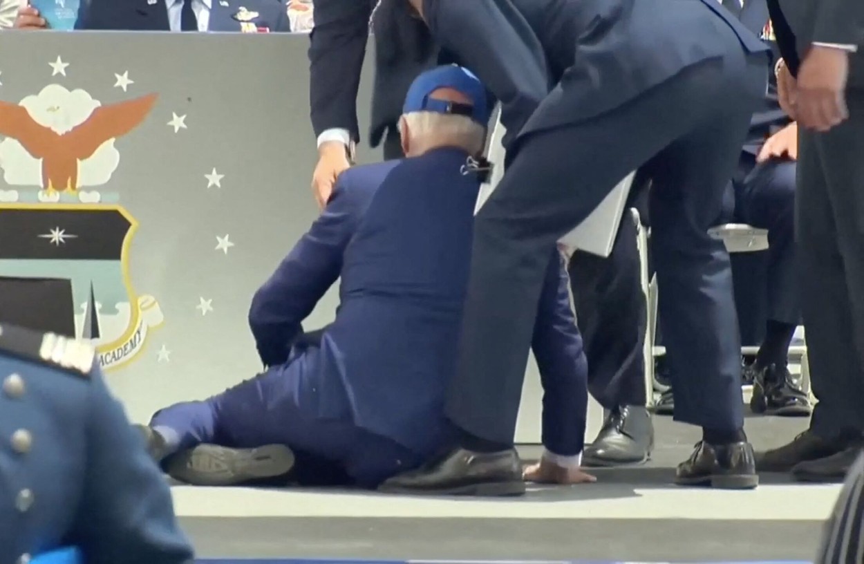 După ce Biden a fost ajutat să se ridice, a dat de înțeles că s-a împiedicat de un sac de nisip folosit pentru a stabiliza un prompter, potrivit Reuters.