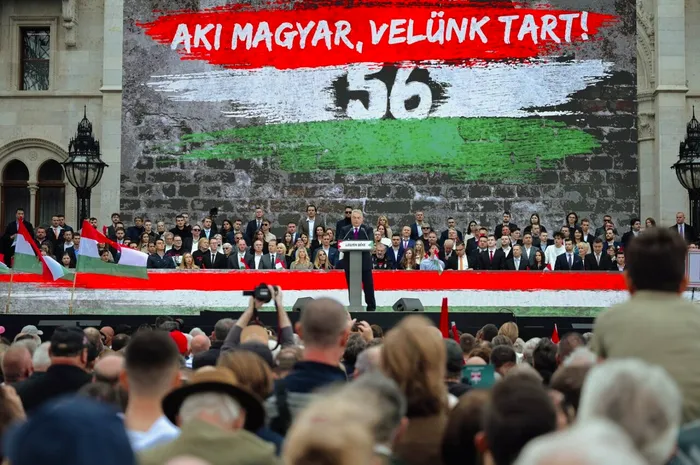 Premierul maghiar Viktor Orban ține un discurs în fața a zeci de mii de participanți, la Budapesta, cu ocazia comemorării Revoluției anticomuniste maghiare din 1956, oprită în mod sângeros de intervenția trupelor sovietice.