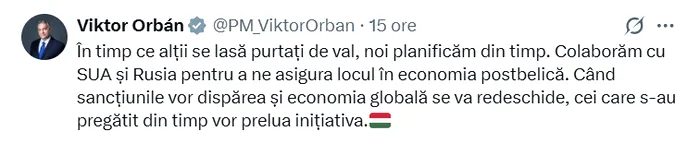 În același timp, Ungaria se pregătește pentru o colaborare economică cu Rusia într-un format post-război. Orban, premierul maghiar, a anunțat că o delegație maghiară se va deplasa la Moscova în următoarele zile pentru a purta discuții privind cooperarea în domeniul afacerilor. Orban a declarat că este vorba despre o misiune importantă, care se va concentra pe pregătirile pentru „pacea post-război” și reintegrarea economică a Rusiei în sistemul mondial.