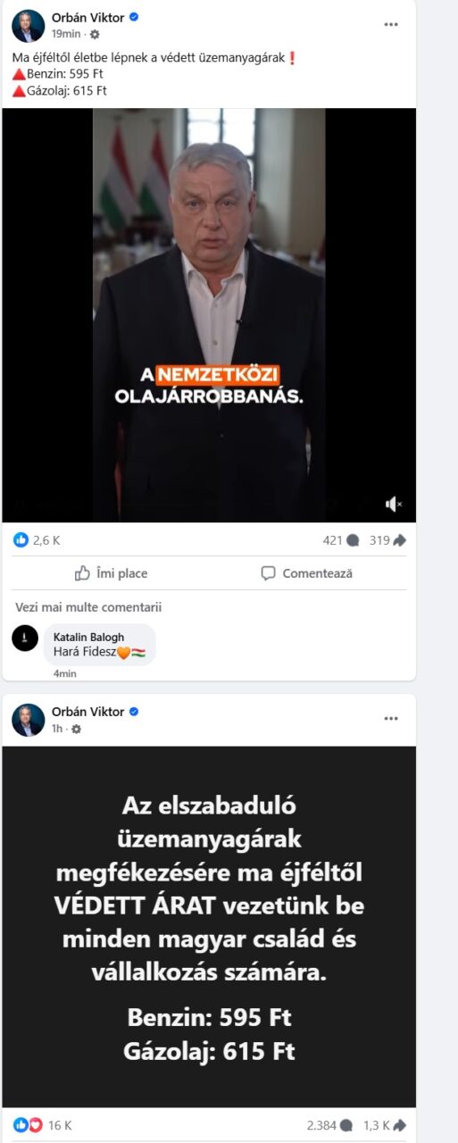 „Prețurile plafonate la combustibil intră în vigoare de astăzi, de la miezul nopții!”, a scris premierul maghiar pe pagina sa de Facebook.