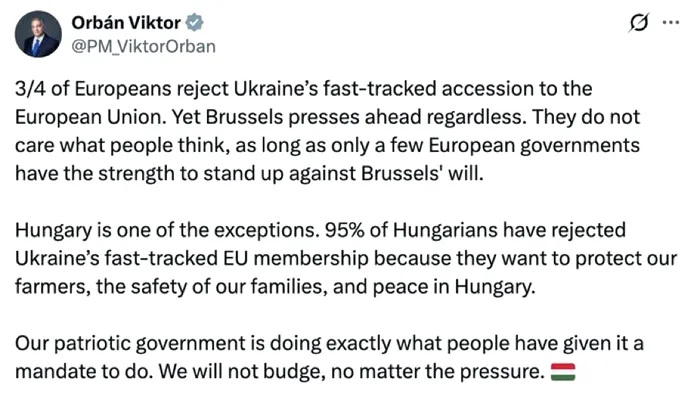 „Trei sferturi din europeni resping aderarea accelerată a Ucrainei la Uniunea Europeană. Și totuși, Bruxelles face presiuni. Nu le pasă de ce gândesc oamenii, că atâta timp cât unele guverne europene încă au puterea de a se opune voinței Bruxelles-ului. Ungaria este una dintre excepții. 95% dintre maghiari au respins ca Ucraina să devină membru UE în ritm accelerat pentru că vor să ne protejeze fermierii, să locuiască în siguranță cu familiile noastre și pentru că vor pace în Ungaria. Guvernul nostru patriotic face exact ce ne-au cerut oamenii în acest mandat. Nu ne vom clinti, indiferent de presiune.”, a scris premierul maghiar pe platforma X.