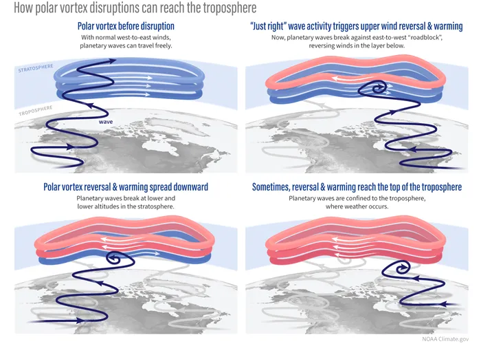 Meteorologul Amy H. Butler, care lucrează la Administrația Națională Oceanică și Atmosferică, avertizează că încălzirea destabilizează vortexul polar, rezultând vânturi extrem de puternice care vor ține aerul rece blocat în zona arctică.