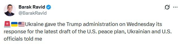 „Miercuri, Ucraina a trimis administrației Trump răspunsul său la ultimul proiect de plan de pace al SUA, mi-au comunicat oficiali ucraineni și americani”.