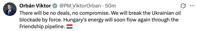 „Nu vor exista înțelegeri, nici compromisuri. Vom rupe blocada petrolieră ucraineană prin forță. Energia Ungariei va curge în curând din nou prin conducta Drujba”, a scris Viktor Orban pe pagina de X.