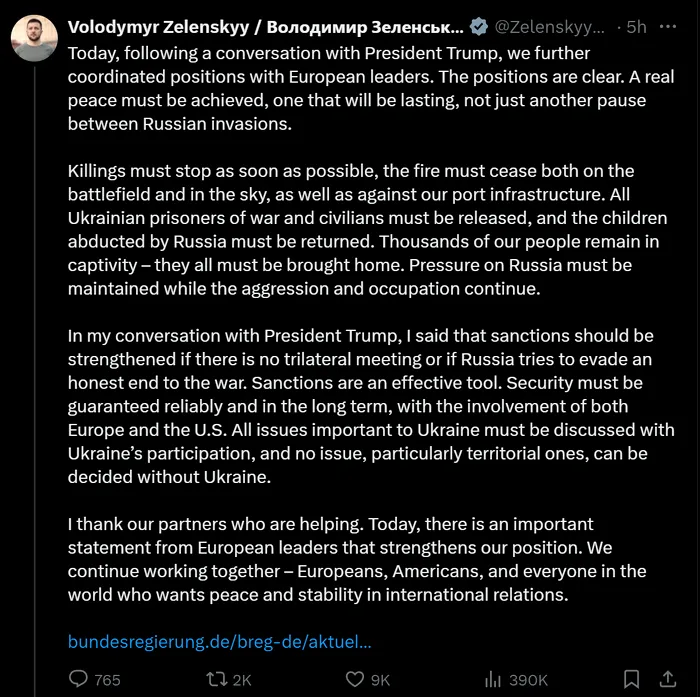 „Toți prizonierii de război și civilii ucraineni trebuie eliberați, iar copiii răpiți de Rusia trebuie returnați. Mii de oameni ai noștri rămân în captivitate – toți trebuie aduși acasă. Presiunea asupra Rusiei trebuie menținută în timp ce agresiunea și ocupația continuă. În conversația mea cu președintele Trump, am spus că sancțiunile ar trebui consolidate dacă nu va exista o întâlnire trilaterală sau dacă Rusia încearcă să evite o încheiere onestă a războiului. Sancțiunile sunt un instrument eficient. Securitatea trebuie garantată în mod fiabil și pe termen lung, cu implicarea atât a Europei, cât și a SUA”.