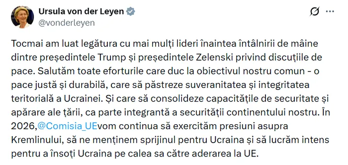 Ursula von der Leyen a confirmat convorbirea telefonică într-o postare pe X și a precizat, în același timp, că orice acord de pace trebuie să protejeze suveranitatea și integritatea teritorială a Ucrainei.
