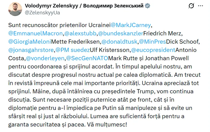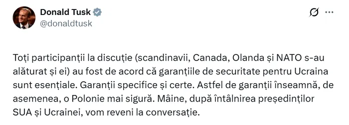 Partenerii de discuție ai lui Zelenski au convenit că problema cheie este reprezentată de garanțiile de securitate concrete și clare pentru Ucraina, a menționat pe X prim-ministrul Poloniei, Donald Tusk. Toți partenerii europeni sunt de acord că Ucraina are nevoie de garanții de securitate concrete și precise.