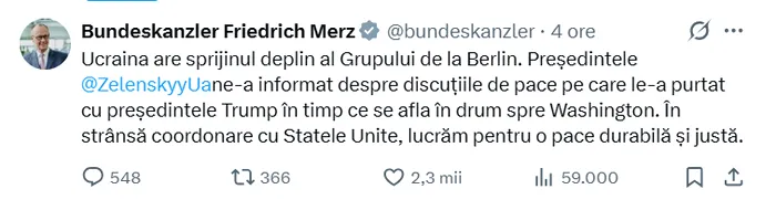 De asemenea, Friedrich Merz a exprimat sprijinul total al Germaniei și al partenerilor europeni pentru poziția Ucrainei în negocieri. Președintele franez, Emmanuel Macron, a spus că atacurile rusești din această dimineață demonstrează dorința Rusiei de a prelungi războiul, nu de a-l încheia.