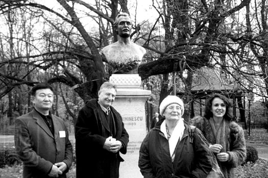 Discuția cu Gombojav Mend-Ooyo a fost prilejuită de ceremonia primirii de către poetul mongol a titlului de Doctor Honoris Causa al Universității Creștine ”Dimitrie Cantemir” din București. Poetul spune că a fost onorat să i se înmâneze această distincție în țara care l-a dat pe Mihai Eminescu patrimoniului mondial al poeziei. În anul 2002, când a mai vizitat România, s-a fotografiat în fața statuii lui Eminescu din Iași.