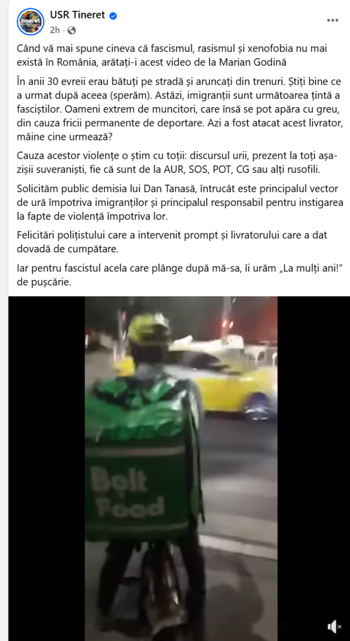 „Un om a fost bătut pe stradă. Motivul? Era un livrator străin care ducea mâncarea cuiva. Sună cunoscut, nu-i așa? Istoria ne învață că, în anii ’30, evreii erau hărțuiți, bătuți pe stradă și aruncați din trenuri. (…) Aceasta este România pe care o dorește partidul AUR și, în special, Dan Tanasă – principalul vector de ură împotriva imigranților. Toți avem, în viața aceasta, dorința de a trăi mai bine, indiferent dacă suntem români, pakistanezi, nepalezi, britanici sau americani. Toți suntem egali în fața legii, indiferent de culoarea pielii, sex, rasă, religie sau orientare sexuală. Oamenii pe care Dan Tanasă îi urăște sunt oameni muncitori, care trăiesc adesea în condiții extreme pentru ca noi să ne primim mâncarea acasă. Sunt oameni care trimit bani familiilor lor din țările de origine. Sunt oameni care plătesc taxe și impozite aici, în România. Nu vi se pare familiar?”.