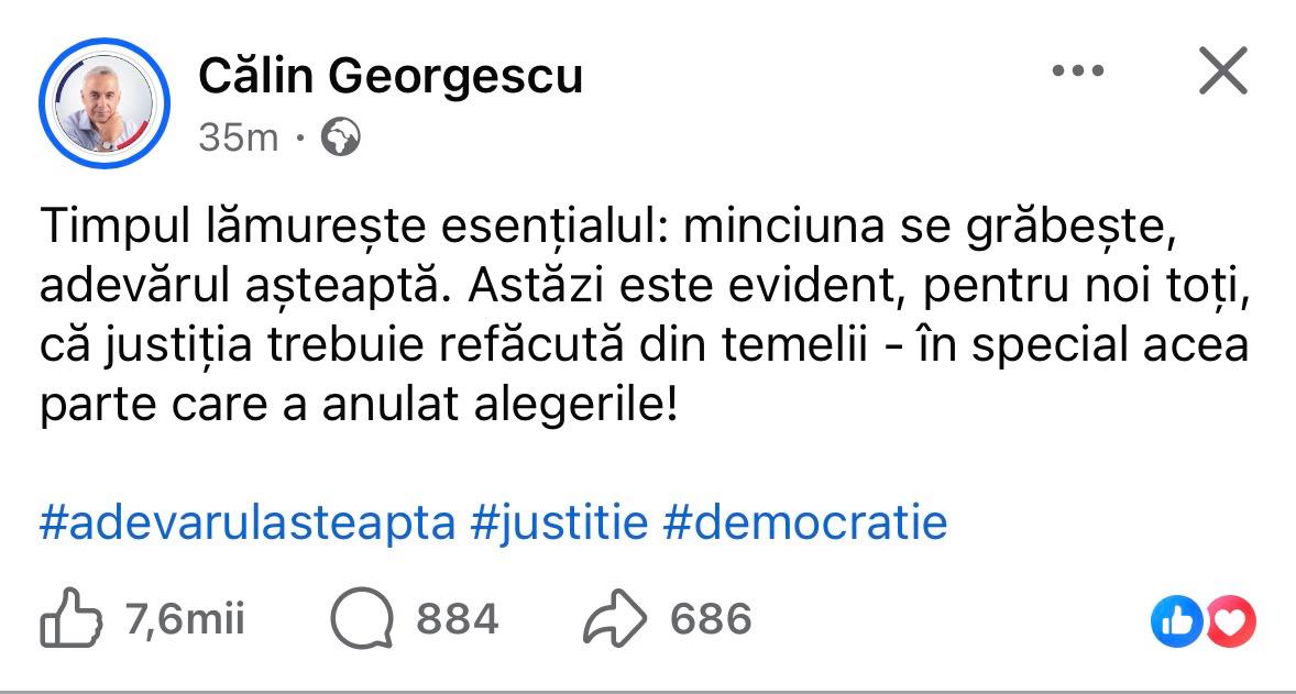„Timpul lămurește esențialul: minciuna se grăbește, adevărul așteaptă. Astăzi este evident, pentru noi toți, că justiția trebuie refăcută din temelii – în special acea parte care a anulat alegerile!”, a scris Georgescu, pe Faceebok, care este trimis în judecată în două dosare.