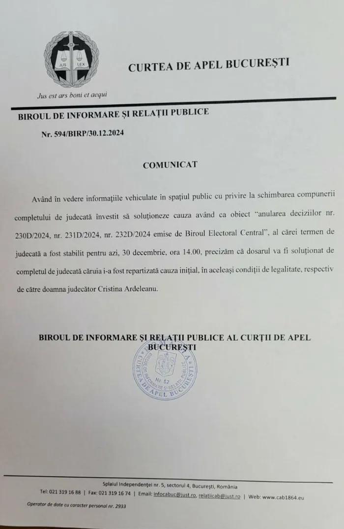 Curtea de Apel București a transmis o informare în care se menționează că dosarul depus de Călin Georgescu va fi „soluționat de completul de judecată căruia i-a fost repartizată cauza inițial, în aceleași condiții de legalitate, respectiv de către doamna judecător Cristina Ardelean.”