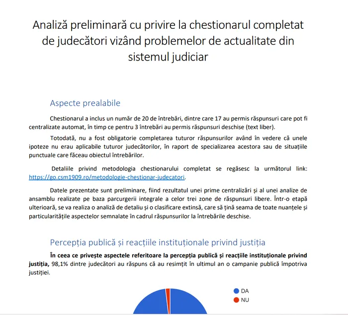 Totodată, nu a fost obligatorie completarea tuturor răspunsurilor având în vedere că unele ipoteze nu erau aplicabile tuturor judecătorilor, în raport de specializarea acestora sau de situațiile punctuale care făceau obiectul întrebărilor, se arată în document.