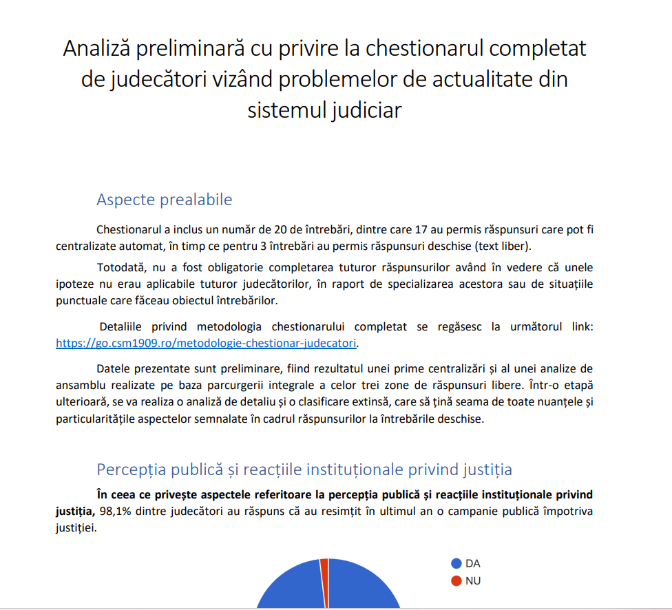 În ceea ce privește aspectele referitoare la percepția publică și reacțiile instituționale privind justiția, 98,1% dintre judecători au răspuns că au resimțit în ultimul an o campanie publică împotriva justiției, se arată în chestionar.