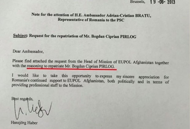 Comandantul Europol pentru Afganistan a trimis două scrisori statului român în care solicita retragerea magistratului Bogdan Pîrlog pentru că ar fi periclitat misiunea