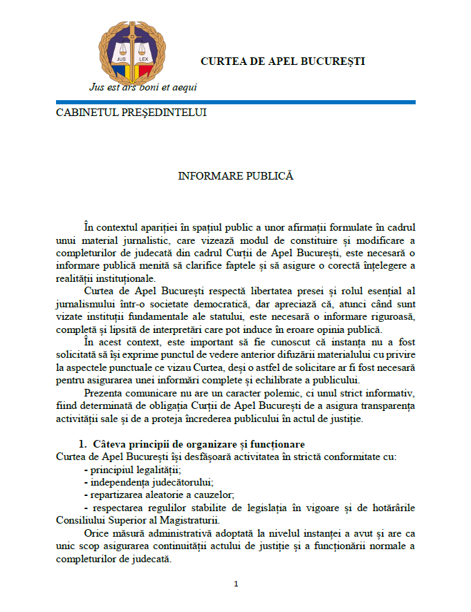 Măsurile Curții de Apel București au urmărit „exclusiv asigurarea continuității activității judiciare” și „respectarea dreptului justițiabililor la soluționarea cauzelor într-un termen rezonabil”.