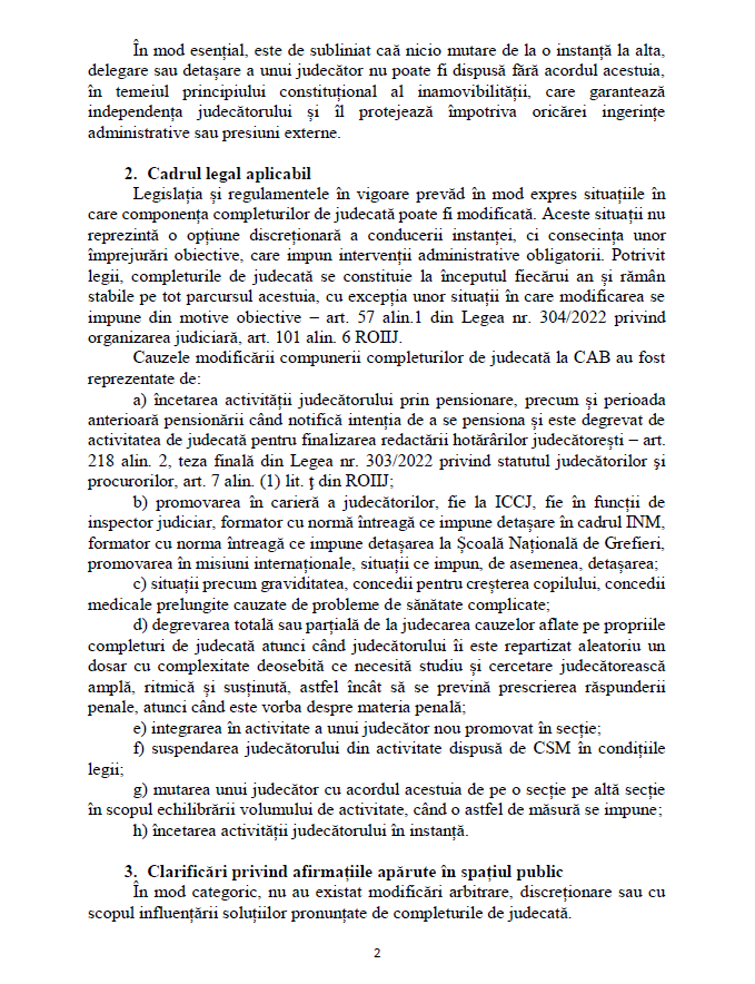 CAB afirmă că își desfășoară activitatea în baza „principiului legalității”, a „independenței judecătorului” și a „repartizării aleatorii a cauzelor”, iar orice măsură administrativă are „unic scop asigurarea continuității actului de justiție”.