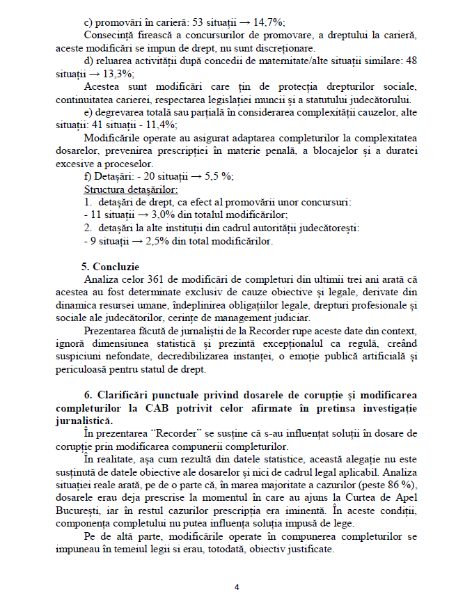 CAB afirmă că cea mai mare parte a modificărilor a fost legată de integrarea în secții a judecătorilor nou veniți, urmată de pensionări/degrevări înainte de pensionare, promovări în carieră, reveniri după concedii, degrevări pentru cauze complexe și detașări.