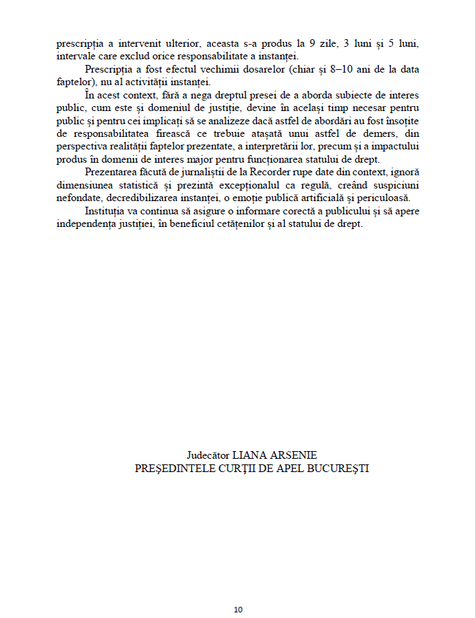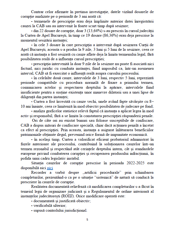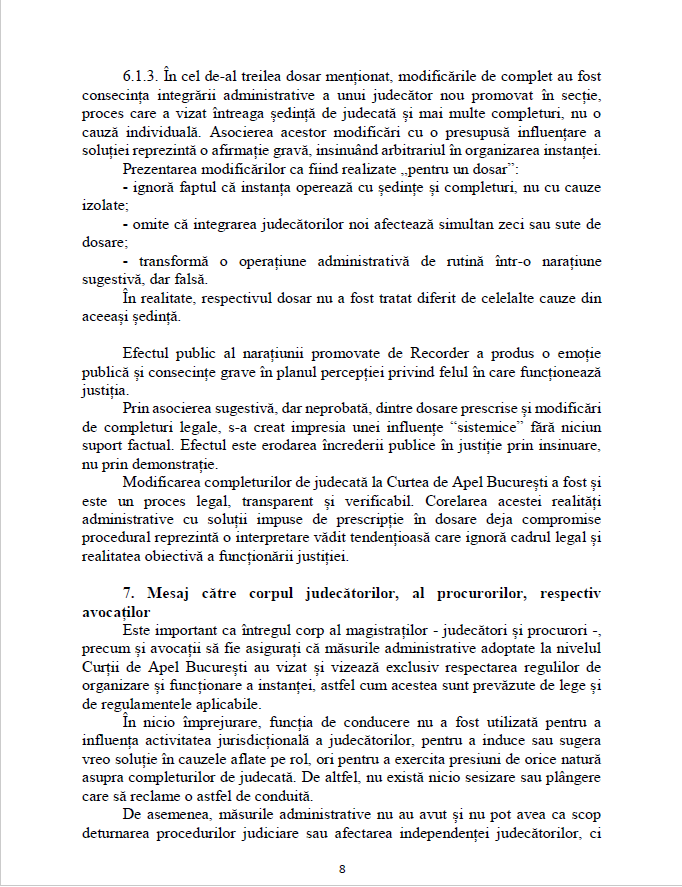 În comunicat, Curtea contestă explicit teza Recorder privind o situație „sistemică” de prescriere produsă prin schimbări de completuri și afirmă că realitatea „documentată” arată că modificările s-au făcut în temeiul legii și al ROIIJ și rămân verificabile ulterior.